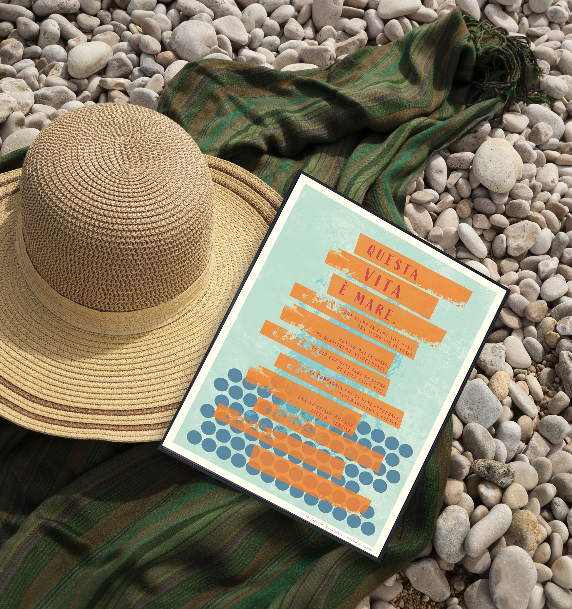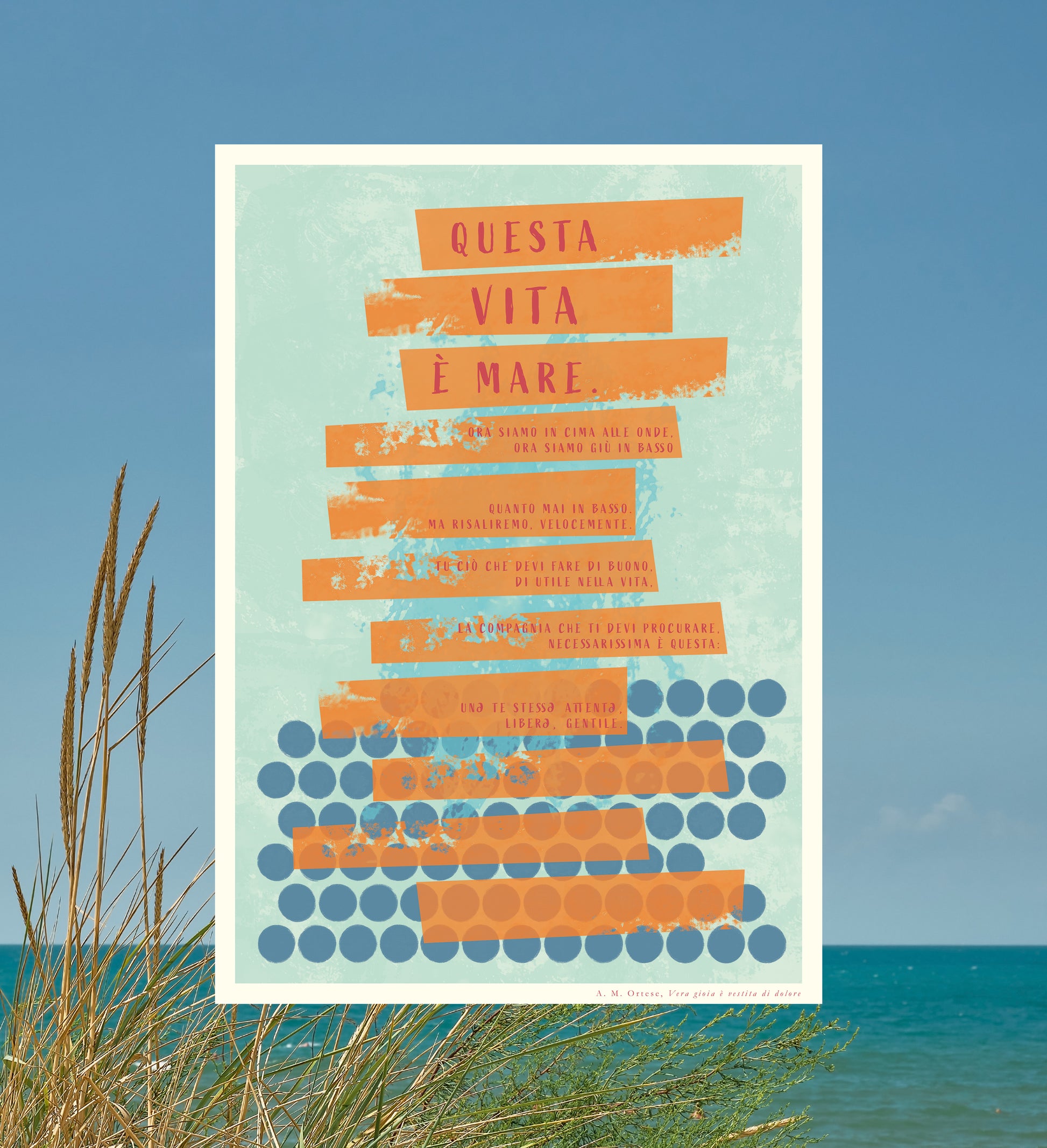 "Questa vita è mare" - manifesto dedicato alla scrittrice Anna Maria Ortese. La citazione è tratta dall'opera "Vera gioia è vestita di dolore" (Adelphi, 2023)