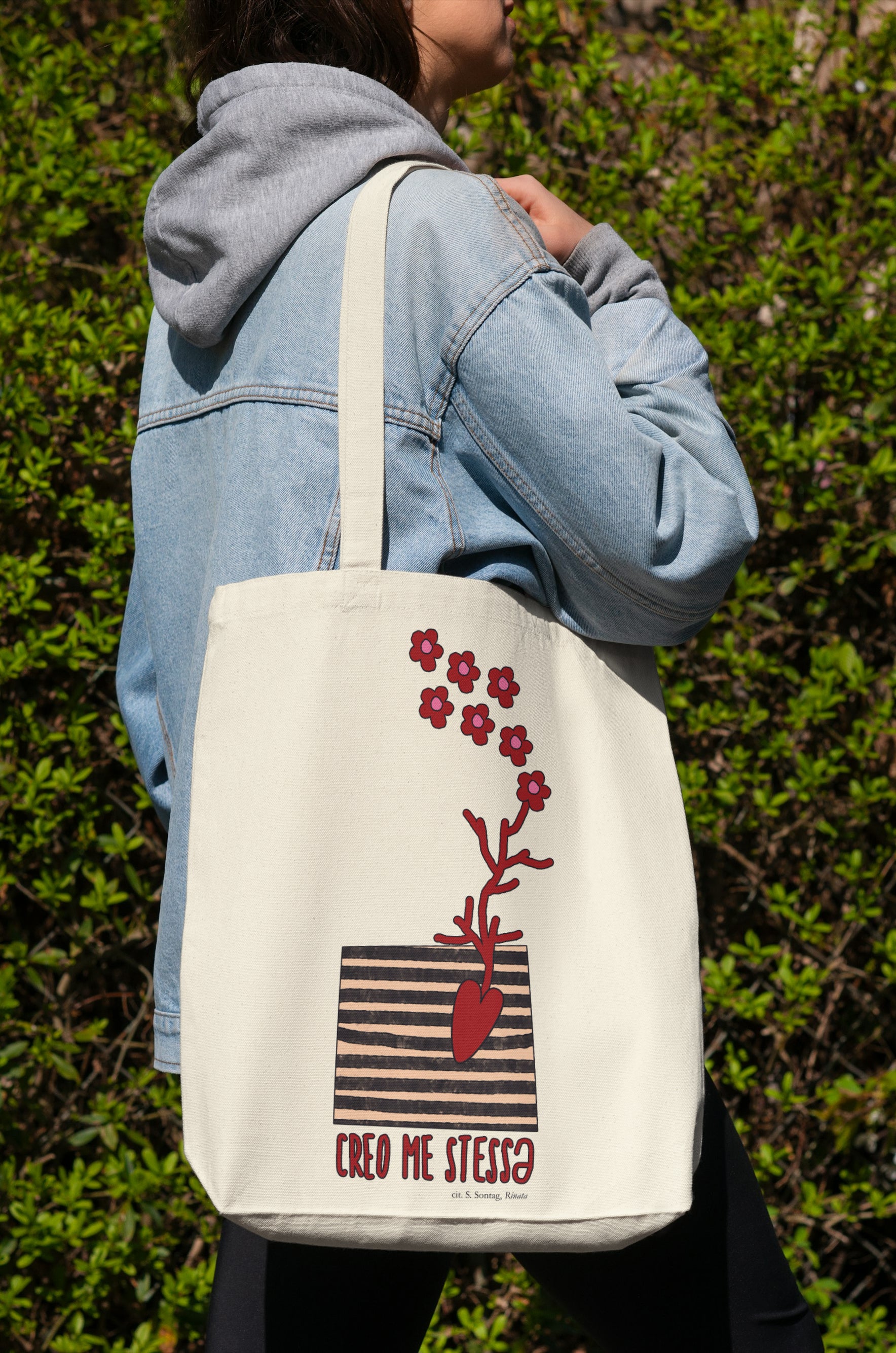 Tote bag in cotone organico certificato. Ha i manici lunghi e unisce la comodità del modello alla sostenibilità ecologica del materiale di produzione.