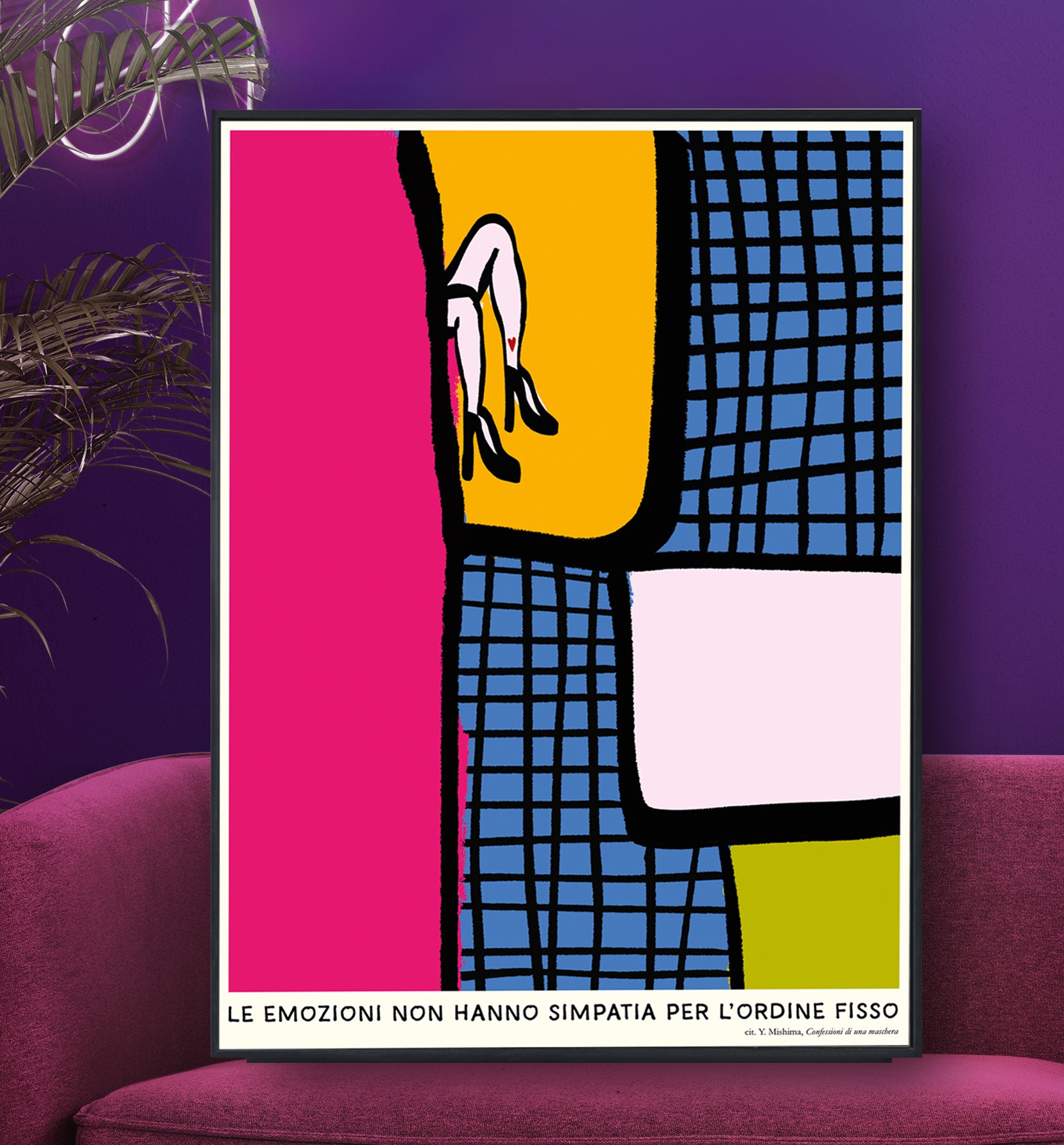 "Le emozioni non hanno simpatia per l'ordine fisso" - manifesto dedicato allo scrittore giapponese Y. Mishima. La citazione è tratta dal romanzo "Confessioni di una maschera" (Feltrinelli, 2025)